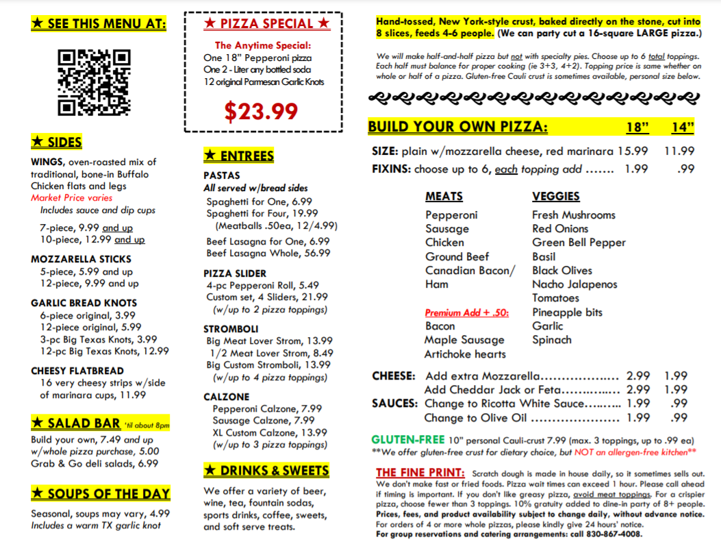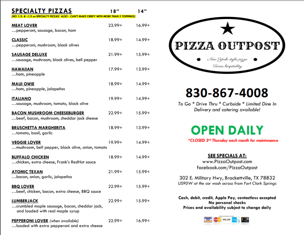 Customer testimonials speak volumes—Faith and Cassidy rave about the friendly staff and great flavors, while Diego expresses his anticipation to return. The welcoming atmosphere and delicious offerings make The Pizza Outpost a must-visit dining destination in Brackettville.